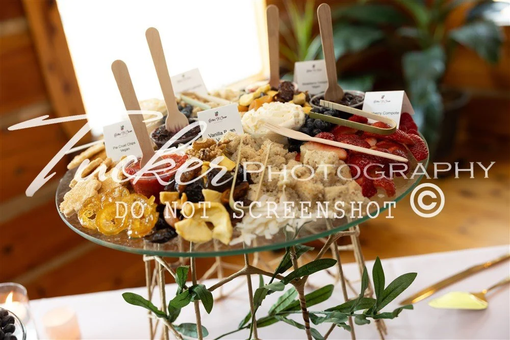 Couple chose a sweetheart cake in vegan lemon blueberry with vintage floral piping details. Complete with our sweet graze charcuterie for guests. Cubed vegan vanilla cake, candied citrus, vegan pie crust flower chips, strawberry compote dip, buttercream, fresh berries, dried fruits, and mixed nuts.